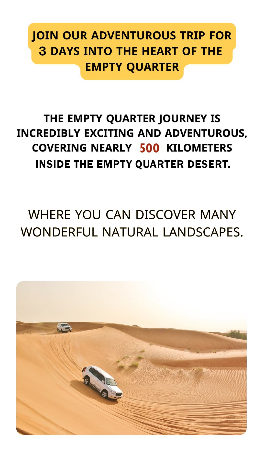 Join our exciting adventure on Empty Quarter (Meteor Strike) trip on Thursdays, Fridays, and Saturdays for a trip filled with adventure.